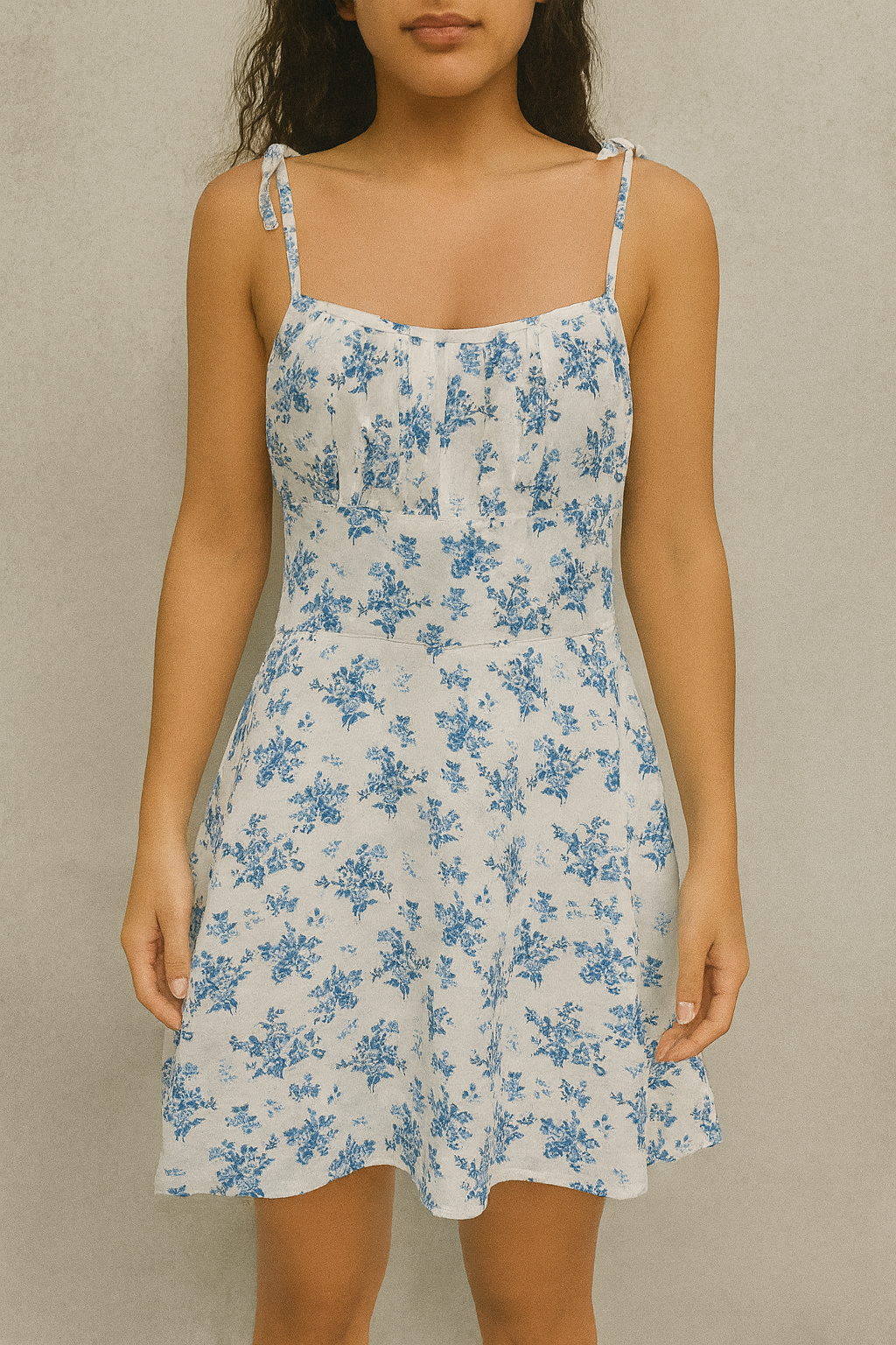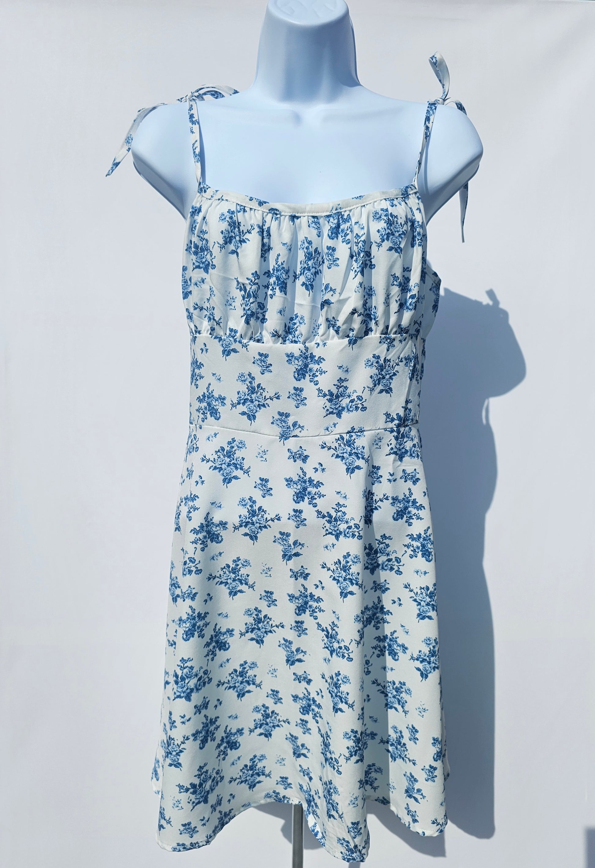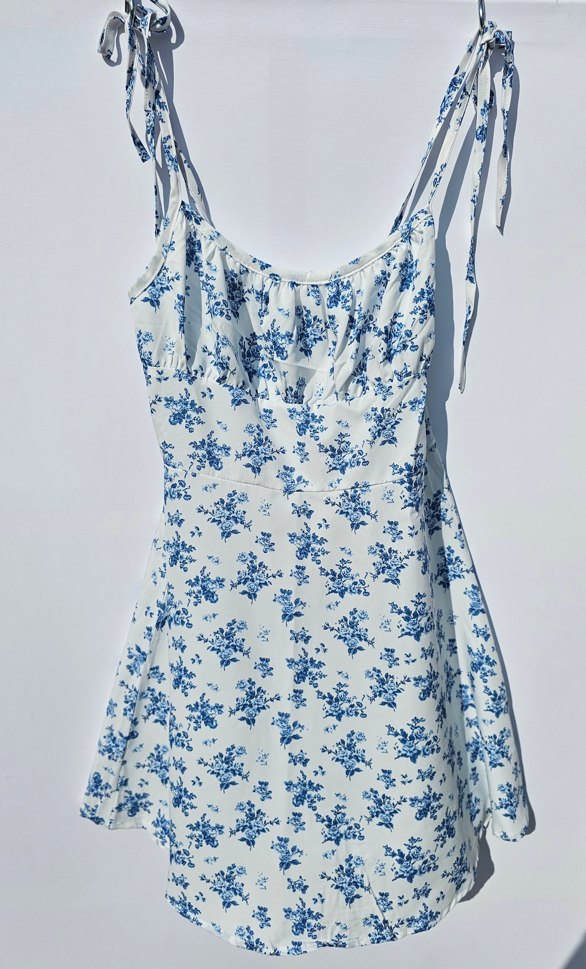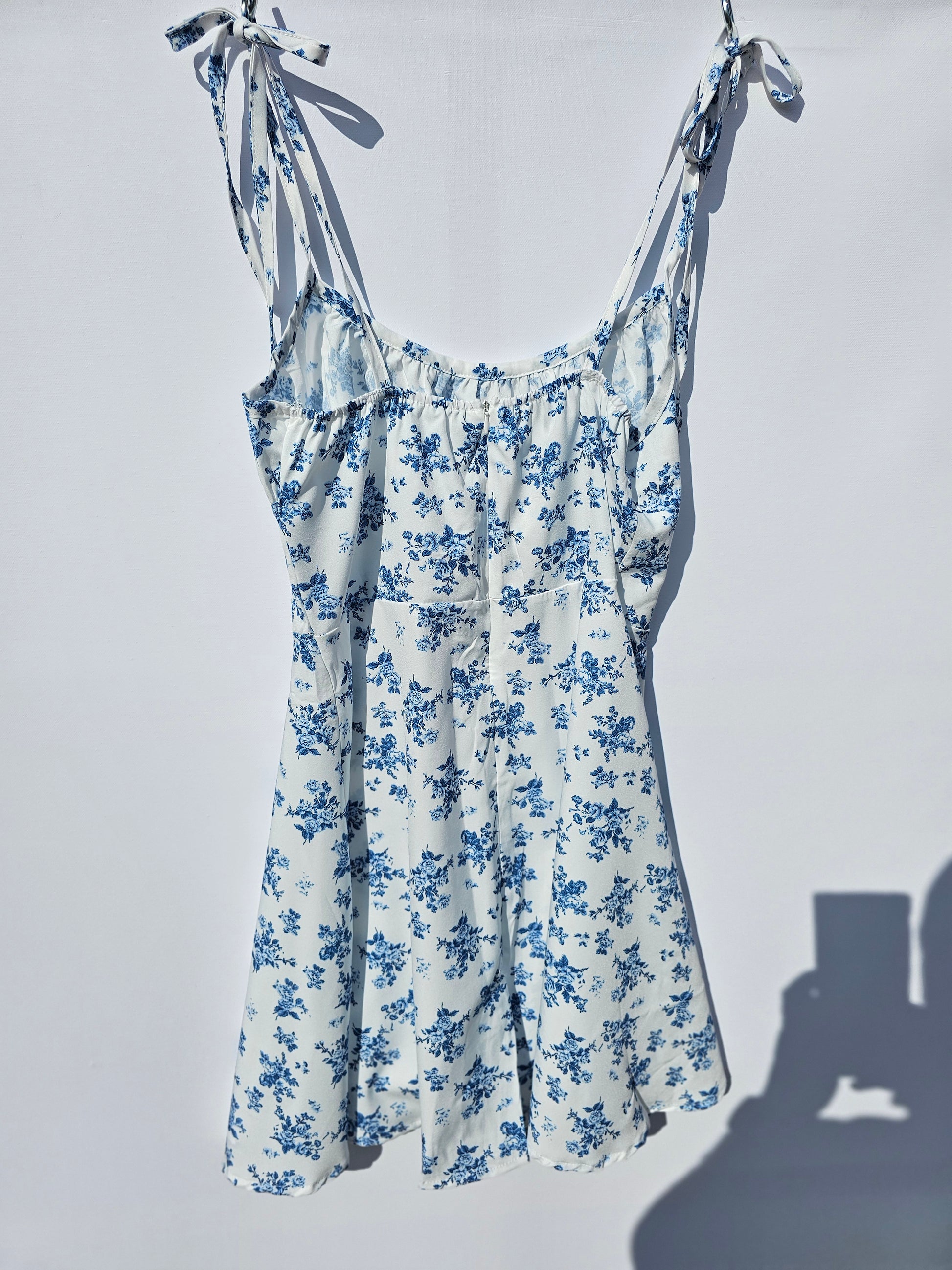 Stay effortlessly chic with this beautiful white sundress adorned with delicate blue floral prints. Designed with adjustable tie straps for a customizable fit, this dress is both flattering and comfortable.