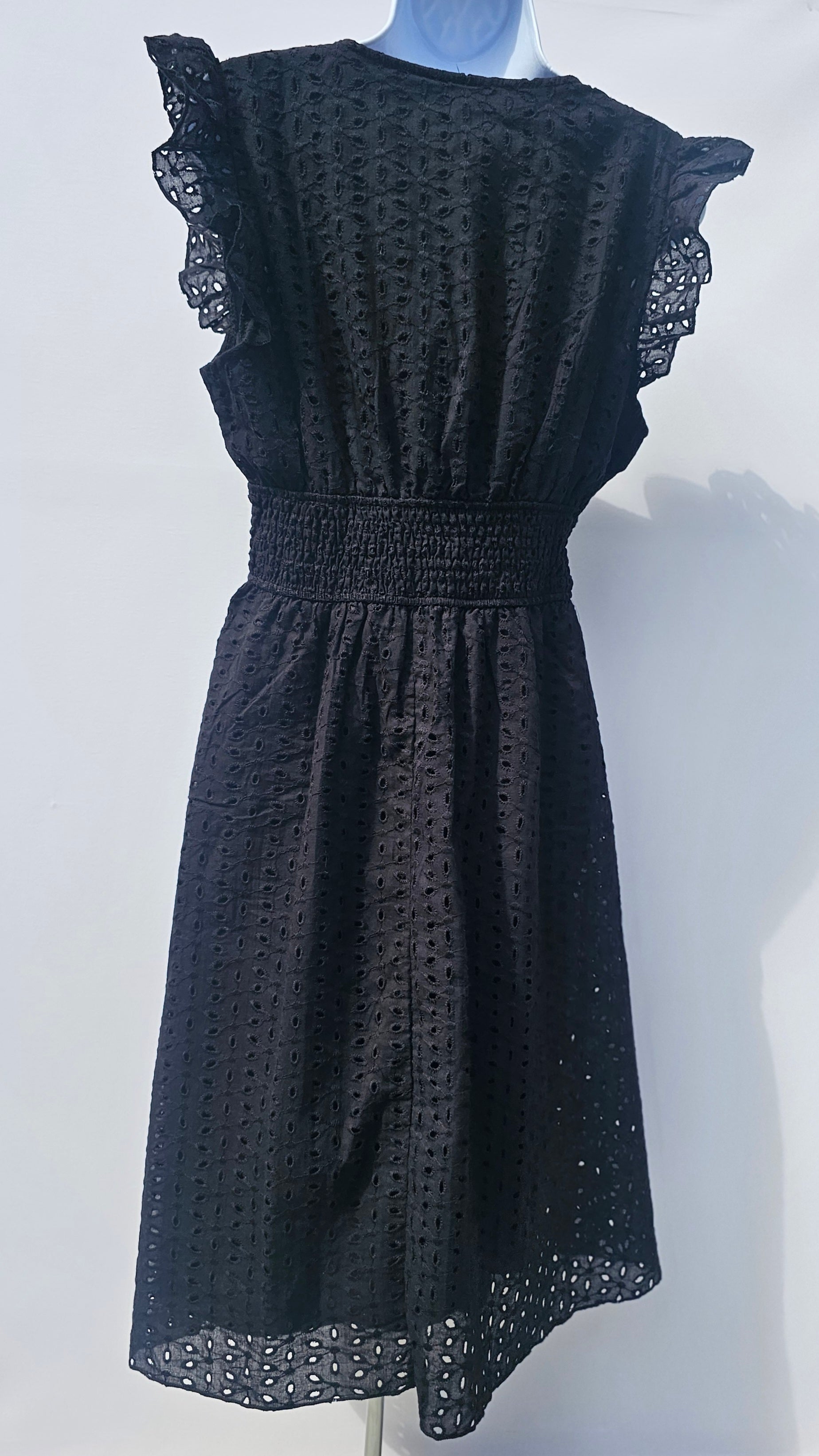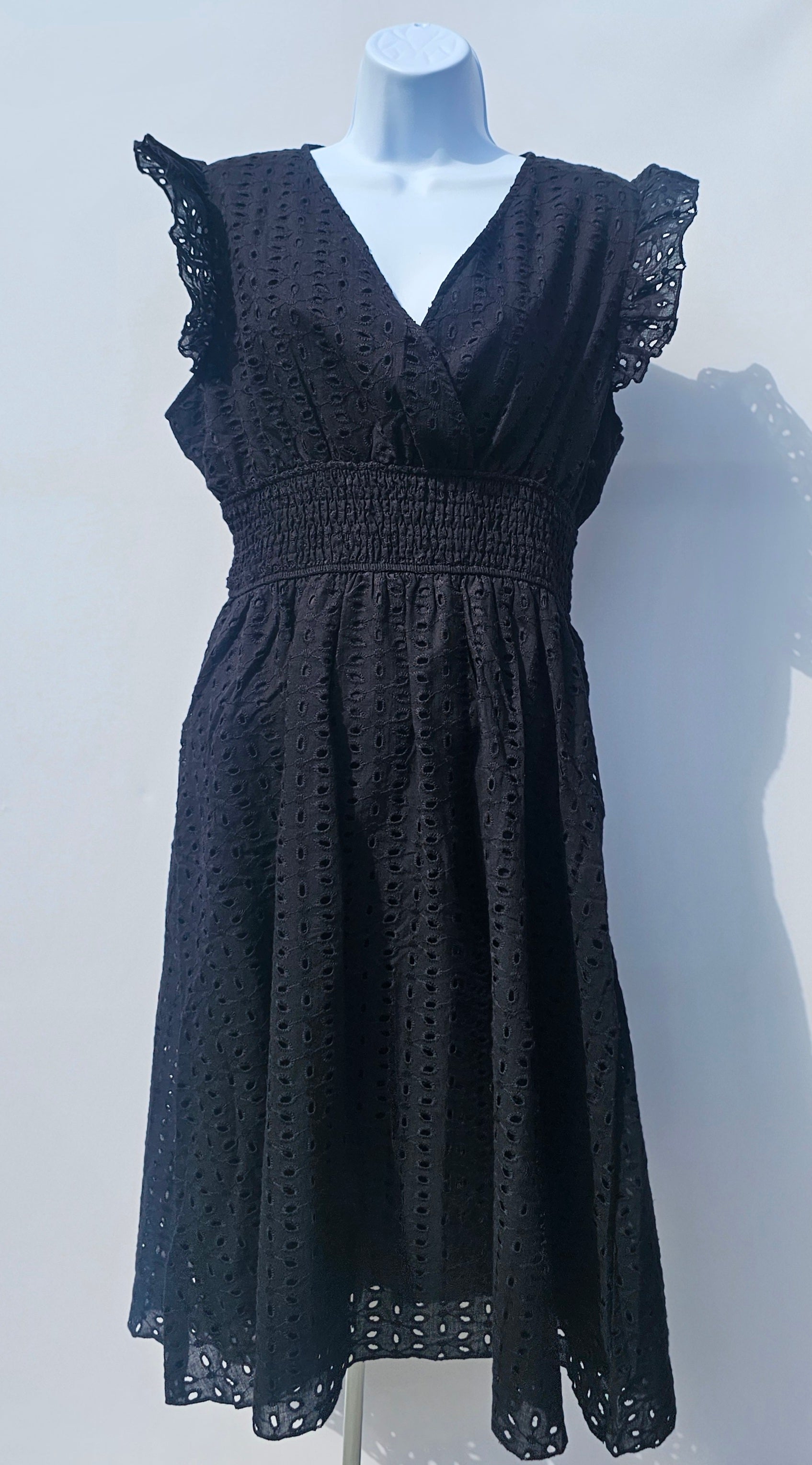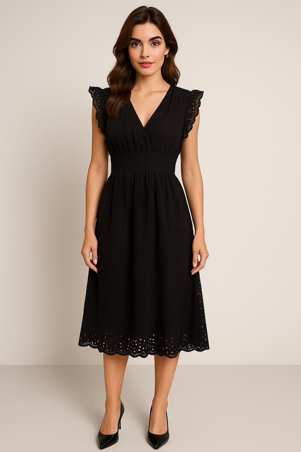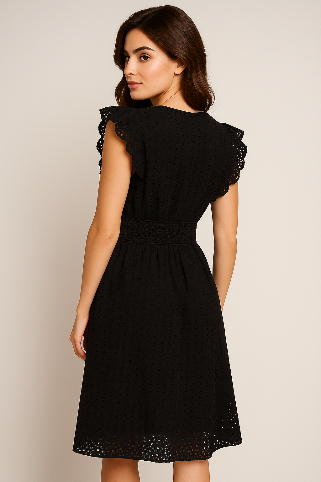 Beautiful black summer dress with a flattering V-neckline and lace-style cutout design. Flare sleeves with ruffle detail Elastic waist for comfort and shape Lightweight, breathable fabric, perfect for warm weather Versatile: wear it to the beach, holidays, parties, or casual outings